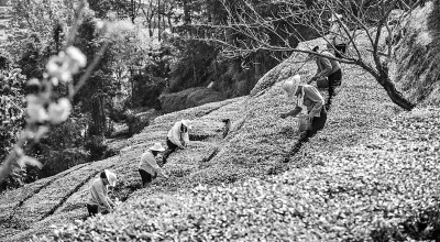 4月8日,湖北黄冈英山县杨柳湾镇茶叶谷春茶迎来采摘季,茶农们穿梭于生态茶园采摘今年的嫩芽。赵广亮摄/光明图片