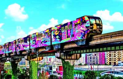 接下来,在为重庆轨道交通进行视觉设计的过程中,设计师们结合设计思维与方法的训练进行了多元探索与实践。有的设计小组在概念分析阶段使用了SWOT分析模型,有针对性地寻找重庆城市文化特色,将重庆发展的过去、现在与未来的相关视觉元素进行归纳,为轻轨车身设计出不同时空主题的“都市长卷”(图①);有的设计小组通过双钻模型,在提出问题的基础上制定设计方案,针对晚间车体照明问题设计出带有夜光景观图案的车身,极富艺术性与未来感;还有的设计小组尝试将涂鸦艺术与重庆方言相融合,当“雄起”“摆龙门阵”“卡卡角角”等土味十足的方言以极具时尚感的形式出现在车身上,瞬间引发了人们的情感共鸣。经过一系列方案讨论与研究,工作坊最终形成的多组设计方案精彩纷呈,大家共同见证了设计思维高效激发创意的魔力。
