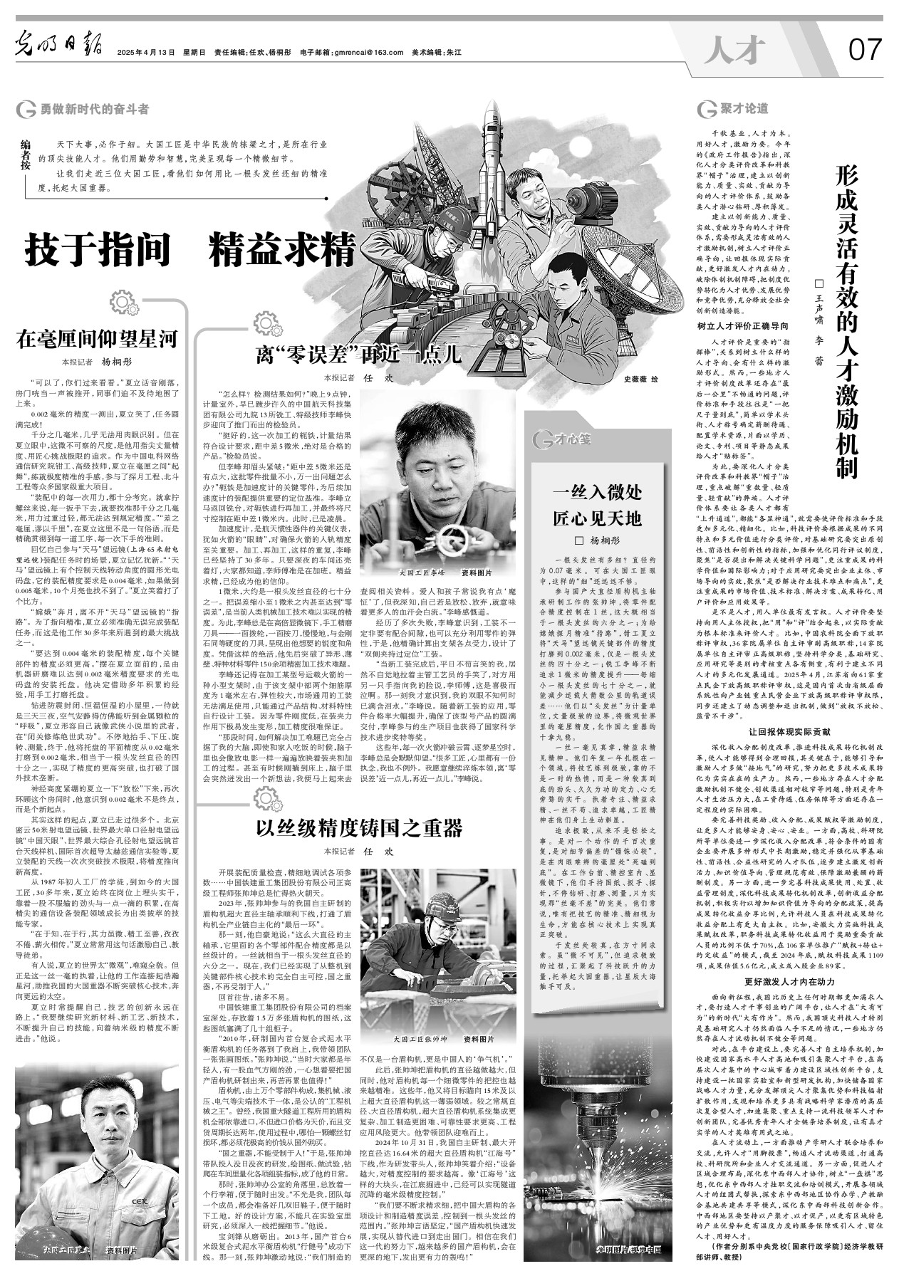 参与国产大直径盾构机主轴承研制工作的张帅坤,将零件配合精度控制在1丝,这大概相当于一根头发丝的六分之一;为给嫦娥探月精准“指路”,钳工夏立将“天马”望远镜关键部件的精度打磨到0.002毫米,仅是一根头发丝的四十分之一;铣工李峰不断追求1微米的精度提升——每缩小一根头发丝的七十分之一,就能减少运载火箭数公里的轨道误差……他们以“头发丝”为计量单位,丈量极致的边界,将微观世界里的毫厘精度,化作国之重器的十拿九稳。