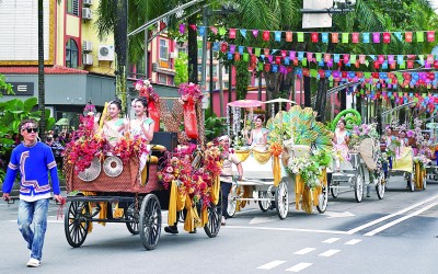 4月14日,云南省西双版纳傣族自治州在景洪市举办泼水节民族民间传统文化游演活动,各族群众代表身着节日盛装载歌载舞,向市民和游客展示了丰富多彩的少数民族传统文化。图为群众代表参加民族民间传统文化游演。梁志强摄/光明图片