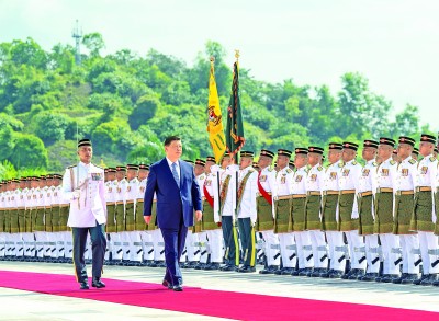 习近平乘车抵达时,易卜拉欣和马来西亚总理安瓦尔在下车处热情迎接。两国元首登上检阅台,军乐团奏中马两国国歌,鸣礼炮21响。习近平检阅仪仗队。两国元首进入国家王宫大厅,同双方陪同人员握手致意。