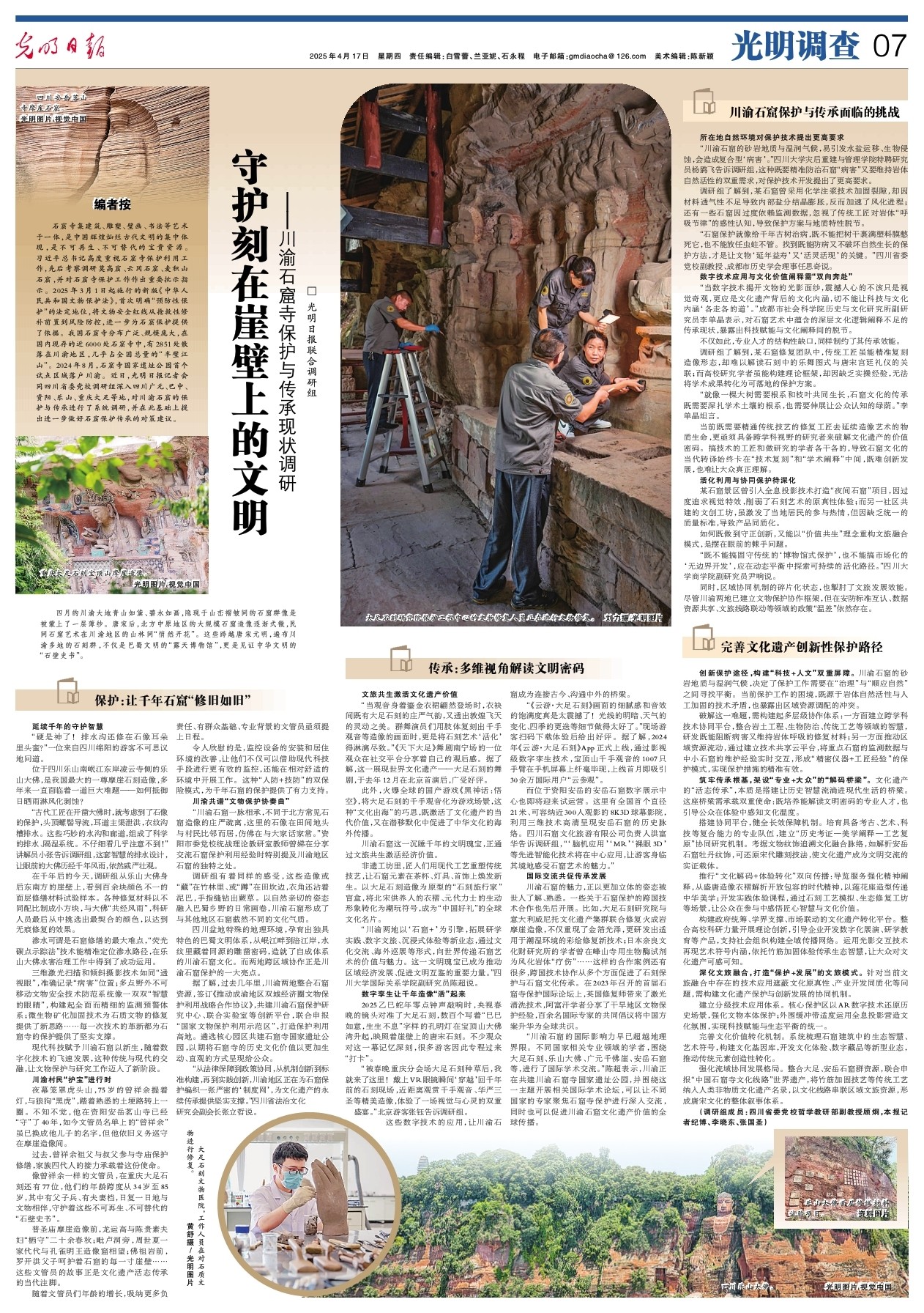 石窟寺集建筑、雕塑、壁画、书法等艺术于一体,是中国辉煌灿烂古代文明的集中体现,是不可再生、不可替代的宝贵资源。习近平总书记高度重视石窟寺保护利用工作,先后考察调研莫高窟、云冈石窟、麦积山石窟,并对石窟寺保护工作作出重要批示指示。2025年3月1日起施行的新版《中华人民共和国文物保护法》,首次明确“预防性保护”的法定地位,将文物安全红线从抢救性修补前置到风险防控,进一步为石窟保护提供了依据。我国石窟寺分布广泛、规模庞大,在国内现存的近6000处石窟寺中,有2851处散落在川渝地区,几乎占全国总量的“半壁江山”。2024年8月,石窟寺国家遗址公园首个试点区域落户川渝。近日,光明日报记者会同四川省委党校调研组深入四川广元、巴中、资阳、乐山、重庆大足等地,对川渝石窟的保护与传承进行了系统调研,并在此基础上提出进一步做好石窟保护传承的对策建议。
