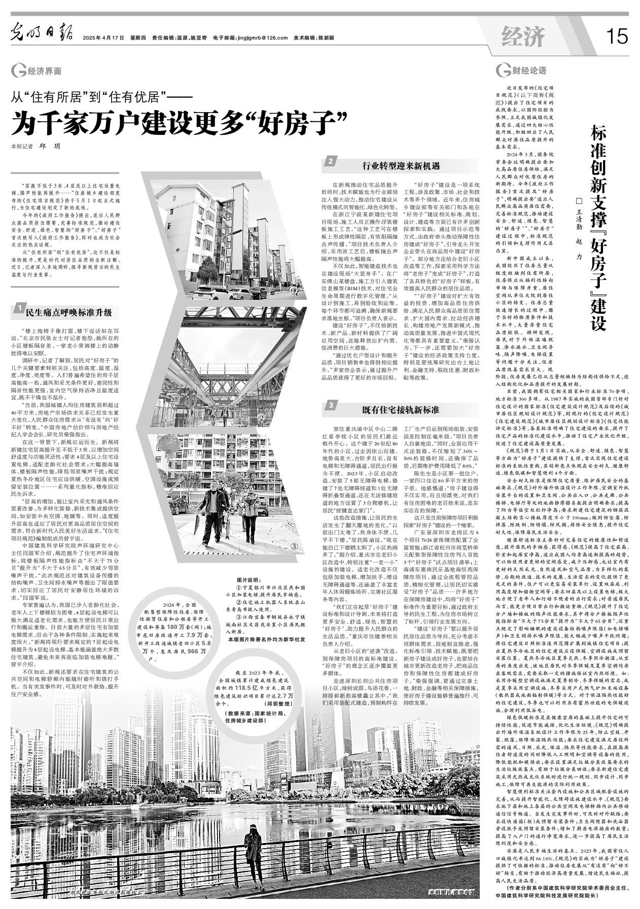 “建设‘好房子’要以提升居民居住品质为导向,充分考虑不同群体需求,因地制宜推进,强化标准引领、技术赋能,既要把新房子建设成好房子,也要结合城市更新改造老房子,把商品住房和保障性住房都建成好房子。”柴强强调,要通过完善土地、财政、金融等相关保障措施,使好房子建设能够普遍推行、可持续发展。