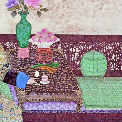 三镶如意是清代兴起的如意样式,分为如意灵芝头、柄中海棠形池与如意云尾三段,分别镶嵌有玉石或宝石,雕件多取八仙庆寿、五福捧寿、五谷丰登等吉庆寓意。故宫博物院藏《慈禧太后园中吉服像》(图②)中,慈禧太后头戴绢花钿子,身穿明黄色曲水地八团龙五谷丰登女吉服袍,安坐于御花园一隅的老松之下。其身侧炕桌上除瓶花牡丹、闻香频婆外,还陈设有一架通体青绿色的碧玺三镶如意,甚为精巧。