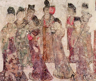 大唐神龙二年,距离永泰公主李仙蕙的溘然长逝已经过去五年,中宗李显将这位十七岁便去世的爱女与驸马迁葬至乾陵陪葬墓,以精美的壁画与陪葬品祭奠这份乱世消散的亲情。《宫女图》(图⑤)是永泰公主墓前室两侧的大型仪仗壁画,在横长近四米、高近两米的巨幅作品中,栩栩如生地描绘了十六位宫廷内帷女性。她们或手持如意、拂尘、纨扇,或举高足杯与烛台,穿梭于墓室壁画的斗拱与门柱之间,形成前七人、后九人的队列。这些女性头绾交心髻或半翻髻,披帛倾垂、长裙曳地,身形动人,不见中晚唐女性的丰腴之姿。画中人物三两成群,神态中可见情感交叠,好似一幅无声的壁上宫闱风景,将彼时的女性形象展现无遗。其中一位仕女身披曙红色披帛,双手持如意托于胸前,如意形似云头,柄横长而微曲,与日本东大寺正仓院收藏的唐代或奈良时期如意颇为相似。