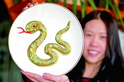 “‘蝈蝈白菜’单是蝈蝈就需要6种绢、118道工序,20天左右才能完成,所有工序均为手工制作,仅‘蝈蝈须’就要40多道工艺,并始终保持不变质、不褪色、不变形。一层一层的白菜叶子更有层层纳福之意。”秦氏绢艺手工艺人秦彦军介绍,“‘蝈蝈白菜’谐音‘国聚百财’,有着祝福祖国繁荣昌盛的美好寓意。”