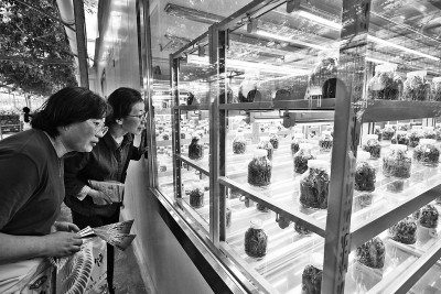 4月20日,第二十六届中国(寿光)国际蔬菜科技博览会在山东潍坊寿光市蔬菜高科技示范园开幕。本届博览会主展区总面积达45万平方米,包括11个室内展馆、日光温室高产栽培区、蔬菜博物馆、休闲农场及室外优质农产品展区,实地种植展示2600多个蔬菜品种,80多种先进种植模式,100多项新技术。博览会将持续至5月30日。图为人们在博览会上观看植物组织培养设备。新华社记者 徐速绘摄