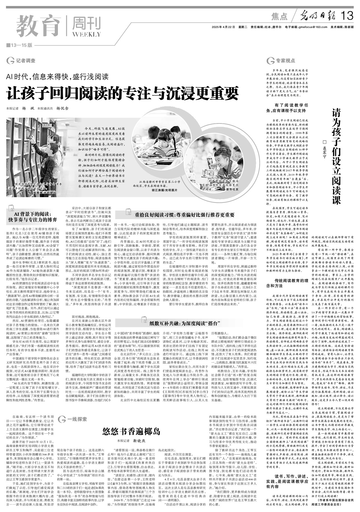 面对碎片化、影像化阅读的考验,孩子们如何才能保有聚精会神、细细品味的深度阅读能力?我们该如何守护那份属于阅读的专注与沉浸?在又一个世界读书日即将到来之际,记者采访师生家长、请教专家学者,共同求解。