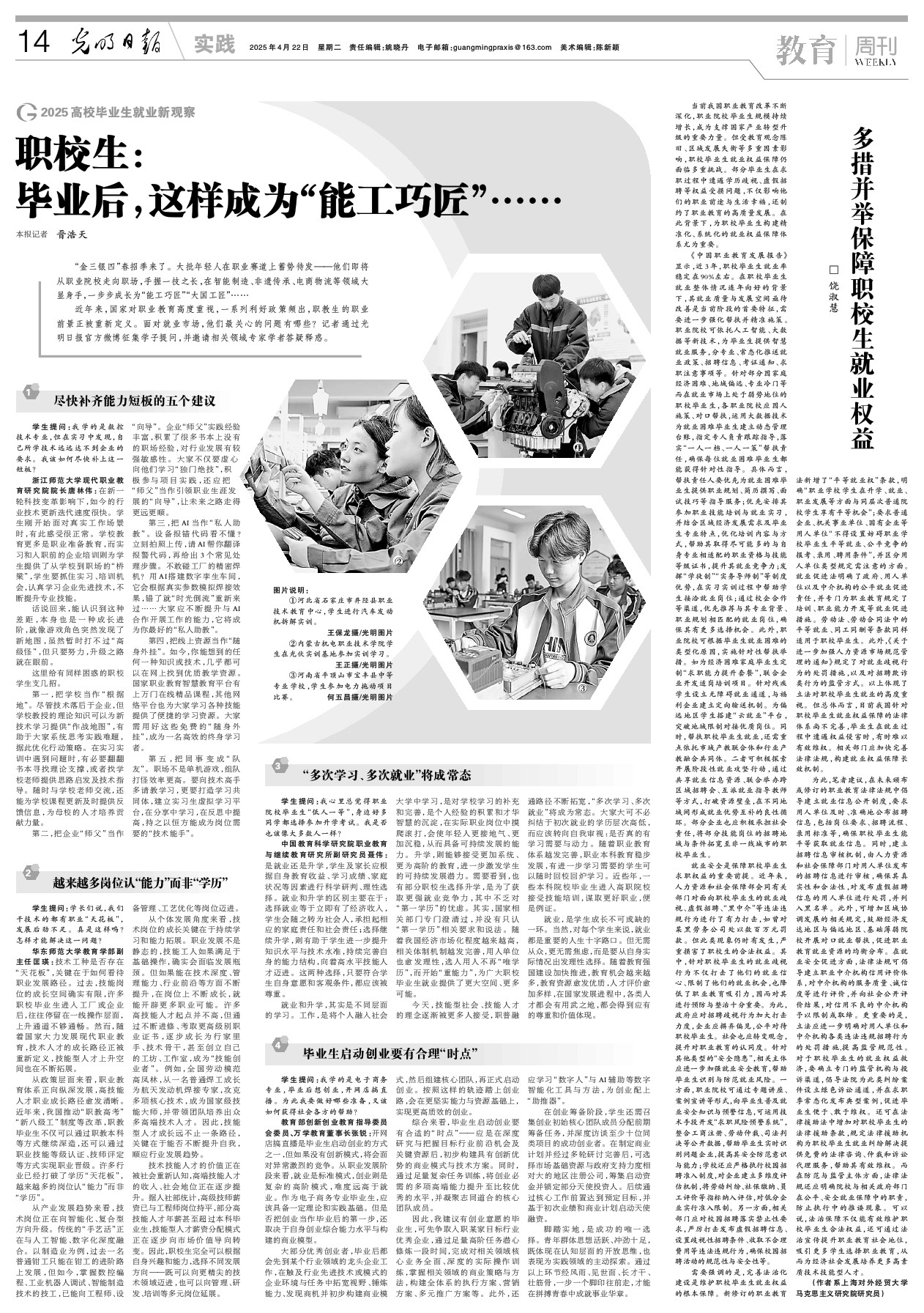需要强调的是,完善法治化建设是维护职校毕业生就业权益的根本保障。新修订的职业教育法新增了“平等就业权”条款,明确“职业学校学生在升学、就业、职业发展等方面与同层次普通院校学生享有平等机会”;要求普通企业、机关事业单位、国有企业等用人单位“不得设置妨碍职业学校毕业生平等就业、公平竞争的报考、录用、聘用条件”,并区分用人单位类型规定需注意的方面。就业促进法明确了政府、用人单位以及中介机构的公平就业促进责任,并专门为职业教育规定了培训、职业能力开发等就业促进措施。劳动法、劳动合同法中的平等就业、同工同酬等条款同样适用于职校毕业生。此外,《关于进一步加强人力资源市场规范管理的通知》规定了对就业歧视行为的处罚措施,以及对招聘欺诈类行为的监管方式。以上体现了立法对职校毕业生就业的高度重视。但总体而言,目前我国针对职校毕业生就业权益保障的法律体系尚不完善,毕业生在就业过程中遭遇权益侵害时,有时难以有效维权。相关部门应加快完善法律法规,构建就业权益保障长效机制。