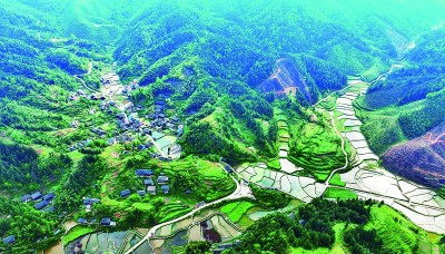 4月21日,贵州省黔东南苗族侗族自治州锦屏县大同乡密洞村绿意盎然,青山苍翠,村庄、公路、农田、绿树构成一幅美丽的生态画卷。姜继标摄/光明图片