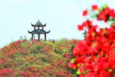 当下,贵州省丹寨县龙泉山的上万亩野生杜鹃花竞相开放,吸引游人登高观赏。图为4月21日,游客在杜鹃花丛中游玩。杨武魁摄/光明图片