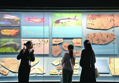 4月27日,辽宁朝阳鸟化石国家地质公园经过升级改造重新开园。位于公园内的辽宁朝阳古生物化石博物馆设主展区“化石王国——热河生物群展厅”及恐龙厅、鸟类起源厅、被子植物厅和哺乳动物厅四个专题展区。新展馆使用面积增加,功能布局更加合理。图为当日游客在辽宁朝阳古生物化石博物馆内参观。新华社记者 李钢摄