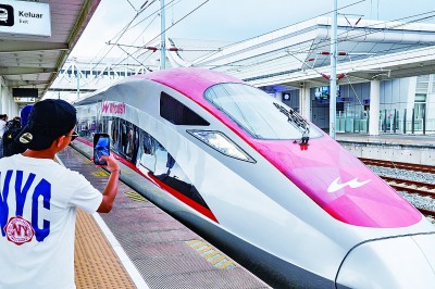 根据印尼中国高速铁路有限公司数据,自2023年10月17日开通运营至2025年4月27日,雅万高铁已累计发送旅客900万人次,累计开行动车组列车26168列,安全运行里程超411万公里。图为4月24日,乘客在雅万高铁帕达拉朗站拍摄进站列车。
