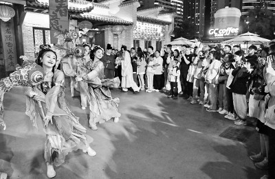 5月3日,游客在河北省秦皇岛市海港区秦皇小巷观看舞蹈演出。