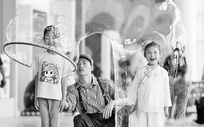 5月4日,在山东省临沂市郯城县醉东风乡村艺栈,游客体验泡泡秀。