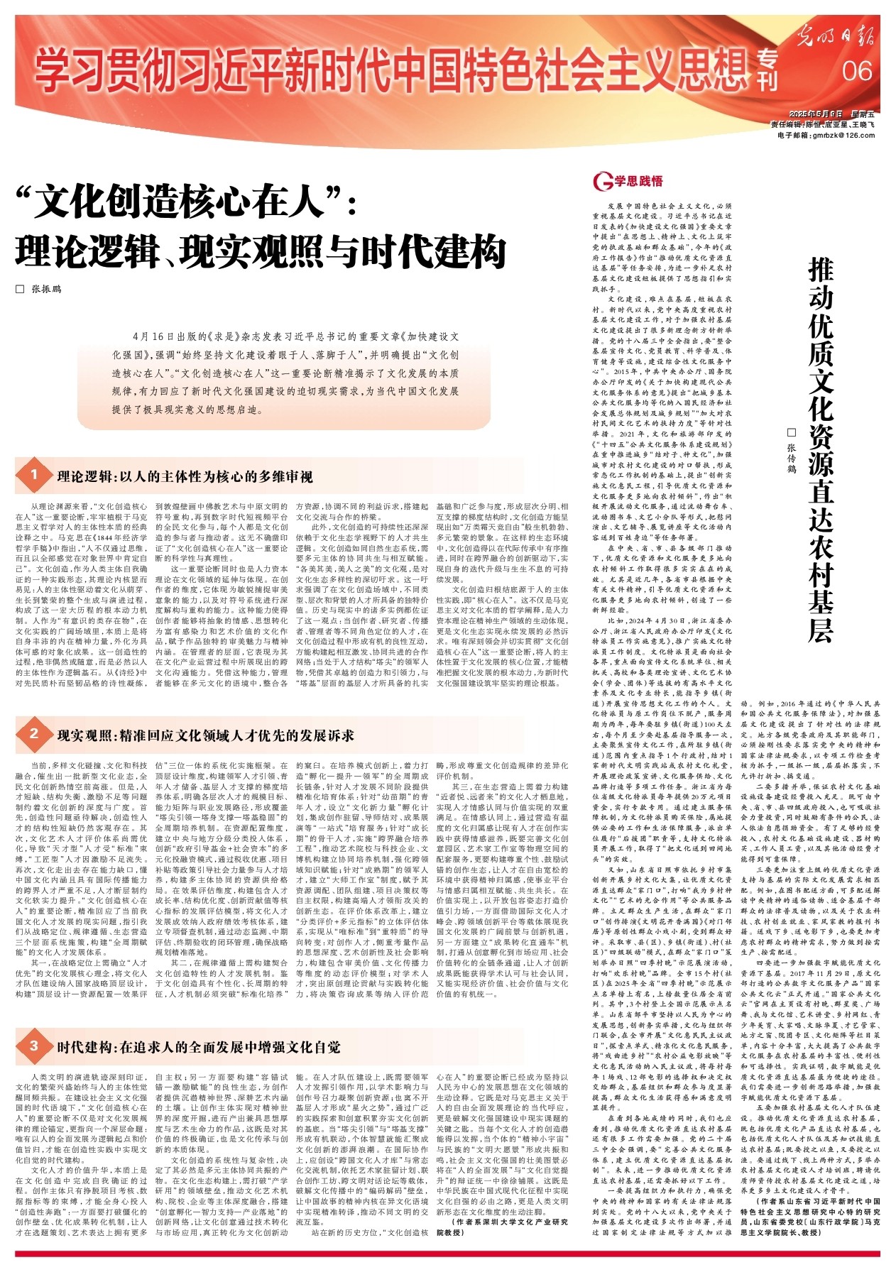 4月16日出版的《求是》杂志发表习近平总书记的重要文章《加快建设文化强国》,强调“始终坚持文化建设着眼于人、落脚于人”,并明确提出“文化创造核心在人”。“文化创造核心在人”这一重要论断精准揭示了文化发展的本质规律,有力回应了新时代文化强国建设的迫切现实需求,为当代中国文化发展提供了极具现实意义的思想启迪。