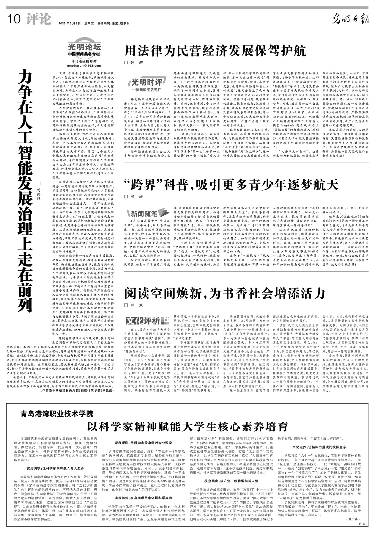 民营经济促进法立足当前、着眼长远,具有鲜明的现实指向,为促进民营经济高质量发展提供了坚强法治保障。从提出“公平竞争”到“规范经营”,再从“服务保障”到“权益保护”,这一针对民营经济发展的法律,对民营企业在发展中的痛点和难点问题,均给予了积极回应。这部法律还设置了“投资融资促进”“科技创新”等专章,支持民营企业参与国家重大战略和重大工程,营造有利于民营企业创新创造的发展环境。数据显示,截至今年1月底,国家高新技术企业中的民营企业,从2012年的2.8万家增长至42万家,占比由62.4%扩大至92%以上。从赋能产业链转型升级的人工智能大模型DeepSeek,到春晚舞台上“惊艳炫技”的智能机器人,再到不断刷新中国影史纪录的《哪吒2》,其背后无不体现民营经济强大的创新活力、潜力和市场竞争力。