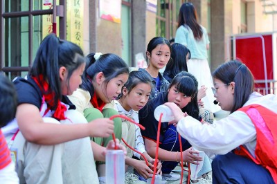 5月12日是第17个全国防灾减灾日。近日,各地开展形式多样的防灾减灾宣传教育及演练培训活动,提高人们科学防灾意识和灾害避险自救能力。图为5月11日,学生在河南省焦作市温县岳村街道慈胜社区防灾减灾宣传活动现场学习制作抛绳器。  新华社发