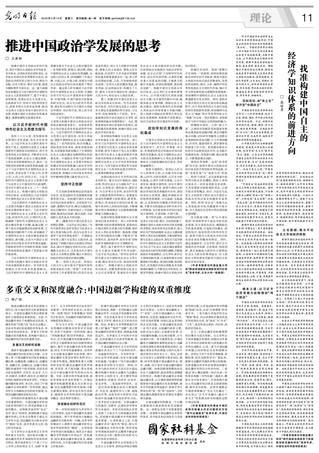 推进边疆治理体系和治理能力现代化,是中国式现代化的重要组成部分。中国的边疆研究和治理探索始终与国家命运紧密相连。当前,中国边疆学尚处于构建和成长阶段,支撑学科的“四梁八柱”尚未完全确立,还没有形成比较成熟的学科体系、学术体系和话语体系。多重交叉和深度融合的双重维度,是构建中国自主的边疆学知识体系的重要方法。