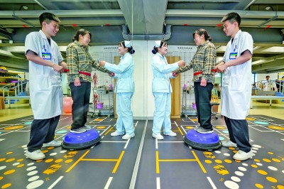 体卫融合开出“运动处方”。在北京市某体育医院,71岁的钱老爷子正单腿站立在晃动的平衡软垫上。这位网球“发烧友”在半月板修复手术36小时后,就被推进了该医院的运动康复中心。“在这里做康复训练,效果好还实惠。”像钱老爷子这样术后便启动专业康复的老年患者,平均住院时间比传统治疗住院时间大大缩短。