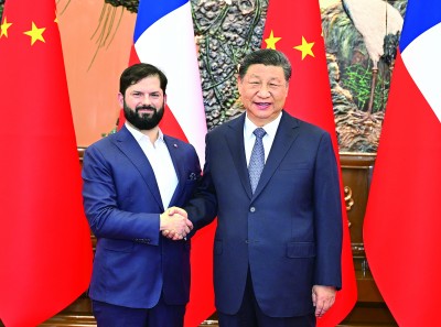 博里奇表示,智利高度重视对华关系。中国已成为智利最重要的贸易伙伴,双方合作造福了两国人民。智方将坚定奉行一个中国原则,期待与中方进一步拓展贸易、投资、人工智能等领域合作,高质量共建“一带一路”,密切人文交流,推动智中关系取得更多实实在在的成果。各国应坚持自由贸易和互利共赢,贸易不应只服务于一国私利,发动贸易战没有出路。智方愿同中方一道,坚定捍卫多边主义和联合国权威,坚持通过对话解决分歧,共同维护国际公平正义。