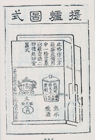 式如提盒,亦余制也。高一尺八寸,阔一尺,长一尺二寸,作三撞。下层一格,如方匣,内用铜造水火炉,身如匣方,坐嵌匣内。中分二孔,左孔炷火,置茶壶以供茶;右孔注汤,置一桶子小镬有盖,顿汤中煮酒。长日午余,此镬可煮粥供客。傍凿一小孔,出灰进风。其壶镬迥出炉格上,太露不雅,外作如下格方匣一格,但不用底以罩之,便壶镬不外见也。一虚一实共二格,上加一格,置底盖以装炭,总三格成一架,上可箾关,与提盒作一副也。