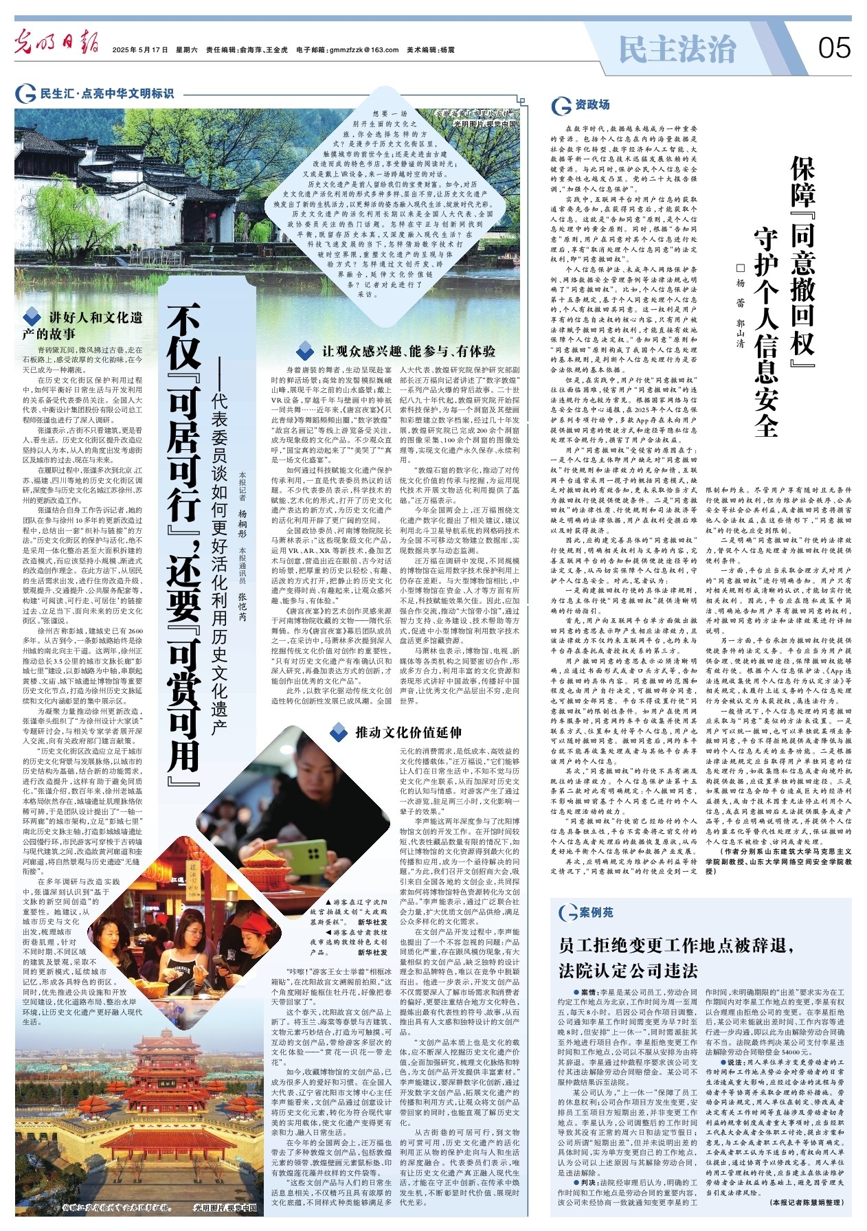 从古街巷的可居可行,到文物的可赏可用,历史文化遗产的活化利用正从物的保护走向与人和生活的深度融合。代表委员们表示,唯有让历史文化遗产真正融入现代生活,才能在守正中创新、在传承中焕发生机,不断彰显时代价值、展现时代光彩。