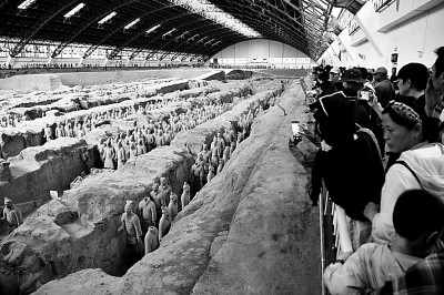 秦俑军阵面朝东方,最大的一号俑坑南北宽62米、东西长230米,有兵马俑约6000件、战车40辆,构成了以步兵为主力、混编一些战车的大型军阵。该军阵纵向分为12列,40辆战车分散配置于中间9列。这样的战车和步兵比例,对于列阵和交战来说完全能够自如运转。二号俑坑大致呈曲尺形,包含了四个部分。第一部分是332个手持弓弩的步兵俑组成的步射手方阵。第二部分是混编少量战车的骑兵阵列,总计陶鞍马108匹、骑兵俑108个、战车6辆。第三部分是以战车为主的阵列,每辆战车有十几个步兵跟随,另有几个骑兵分布其中,总计19辆战车、57个车兵俑、207个步兵俑、8个骑兵俑。第四部分是完全由战车组成的方阵,共64辆战车,每车后有3个车兵俑。