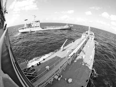 南部战区海军某勤务船大队训练救援受损舰艇。 武欢庆摄/光明图片