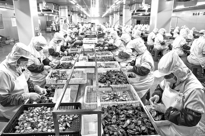 近年来,福建省莆田市鲍鱼及其制品出口企业大力拓展海外市场,出口量和货值年年攀升。图为5月16日,在位于莆田市涵江区的一家海产品公司生产车间里,工人们在处理加工鲍鱼。 新华社记者 魏培全摄