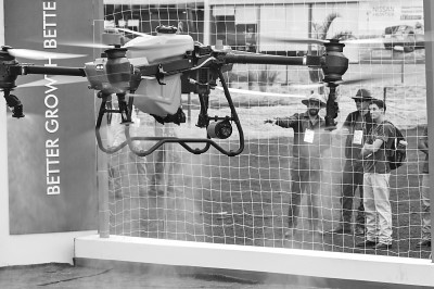 4月29日,在巴西圣保罗州里贝朗普雷图市举行的2025年巴西农业科技展上,参观者观看大疆农业无人机的喷洒演示。新华社发