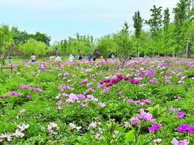 近日,位于北京通州区台湖垛子公园内的芍药灼灼盛开,姹紫嫣红,花香四溢,吸引不少市民游客观赏游玩。赵斯诺摄/光明图片