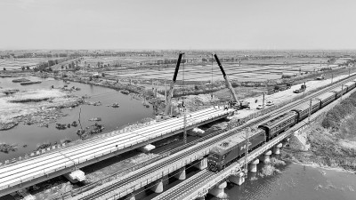 5月19日,随着最后一片75吨T梁架设,中铁二十二局承建的沈山铁路鸭子河中桥新建大桥架梁工程顺利完工,为后续铺轨转线奠定坚实基础。图为当日沈山铁路鸭子河中桥新建大桥架梁工程施工现场。新华社记者 吴青昊摄