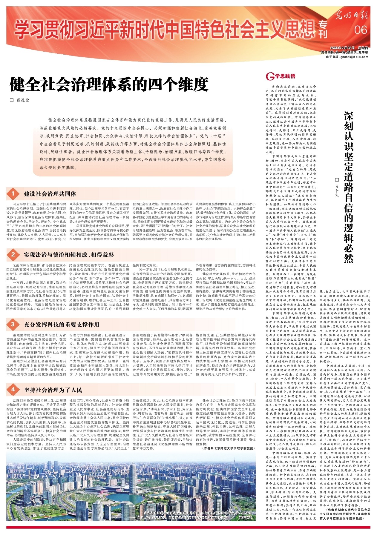 健全社会治理体系,法治和德治如鸟之两翼,车之两轮,缺一不可。因此,必须坚持依法治国和以德治国相结合,使法治和德治在社会治理中相互补充、相互促进、相得益彰。法律有效实施有赖于德治观念的支持,道德践行也离不开法治观念的约束。治理现代化的重要前提是观念的现代化,应从价值观念角度打造先进治理理念,塑造法治与德治相结合的治理文化。