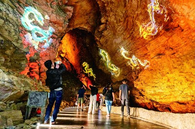 5月20日,湖南张家界黄龙洞景区灯光升级工程正式竣工亮相。此次灯光升级改造以“洞天福地”为主题,以“大鲵化龙”故事为引线,把天然石壁当成巨幕,将光影科技、神话故事和自然景色融为一体,为游客们打造了一场关于光影、神话与自然的奇幻之旅。图为游客在张家界黄龙洞景区游览拍照。新华社记者 陈思汗摄