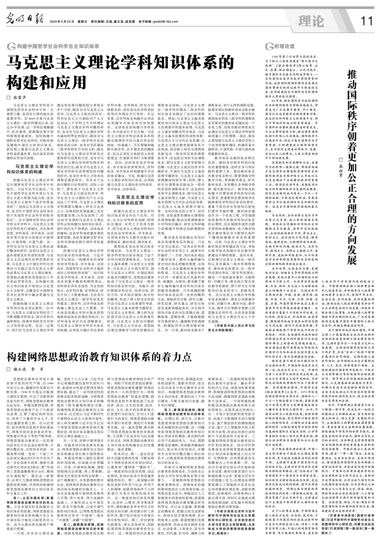 马克思主义理论学科是中国特色哲学社会科学中的一支重要力量,是具有引领性地位的重要学科。自2005年底马克思主义理论一级学科增设以来,经过20年发展,这一学科在规模提升、队伍素质、管理建设等方面均取得显著成效。加快构建中国特色哲学社会科学,归根结底是建构中国自主的知识体系。新征程上推进马克思主义理论学科高质量发展,知识体系的构建和应用刻不容缓。