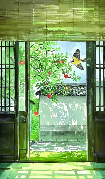 以屋内视角勾勒庭院夏景,阳光穿透榴花帘影洒落满地,黄鹂掠影打破静谧,营造出“梦觉流莺时一声”的闲适意境,展现出盛夏深院的清凉与生机。