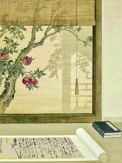 提取诗句中的石榴花、竹帘意象,借鉴中式传统绘画风格,用淡雅色调搭配榴花艳丽色彩,配以书法长卷、古籍元素等,营造出夏日清幽、闲适的意境,也展现榴花的生机,传递悠然自在的生活情趣。