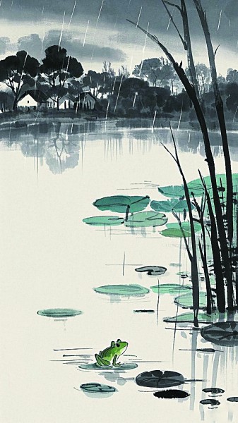 采用传统的水墨手法,通过浓淡相宜的笔触与有限的色彩点缀,呈现出黄梅时节雨后池塘的静谧与蛙声四起的生机。远处背景以灰色调勾勒出屋舍与树林的朦胧轮廓,似是那“有约不来过夜半”的身影,留下一池涟漪与雨声,给观者提供了充分的想象空间。