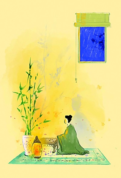 窗、植物、灯具等元素,以几何形态有序排列,构建出稳定而和谐的画面结构。窗外雨夜的蓝色与室内的暖黄色调形成鲜明对比,通过色彩的冷暖反差强化空间感与情绪张力。留白与色块的巧妙搭配,给予观者视觉上的呼吸空间,使人体悟到古典诗词的清幽韵味。