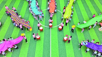 端午节将至,各地举行包粽子、做香囊、龙舟竞渡等丰富多样的民俗活动,人们在浓浓的传统文化氛围中喜迎端午佳节。图为5月23日,在山东省东营市广饶县李鹊镇中心幼儿园,小朋友在进行龙舟赛游戏。新华社发