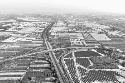 5月26日,山西省运城市建设中的光伏发电项目与东郭高速互通枢纽、麦田相映成景,构成一幅绿色发展新画卷。闫鑫摄/光明图片