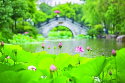 5月28日,福建省福州市茶亭公园内的荷花竞相绽放,在绿叶映衬下,美不胜收。谢贵明摄/光明图片