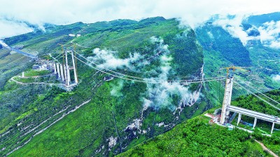 眼下,贵州安(安顺)盘(盘州)高速天门特大桥正抢抓工期,加紧建设,有序推进边跨索夹安装。天门特大桥全长1553米,桥面距离峡谷水面约560米,设计时速100公里。图为5月28日拍摄的建设中的安盘高速天门特大桥。新华社记者 陶亮摄