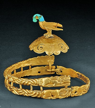 这顶金冠饰造型独特,纹饰精美。它由鹰形冠饰、半球形冠顶和黄金冠带组成,雄鹰傲立冠顶,金灿灿的身躯、绿松石制成的头颈、黄金制成的双目,彰显着华贵。巧妙的是,鹰的头、颈、尾之间由金丝连接,头颈可以左右摇动,当主人策马飞驰时,雄鹰也会随之振动如活物。它融铸造、锤揲、掐丝、錾刻、镂等先进技艺于一身,展现了当时北方游牧部族精湛的贵金属技艺。