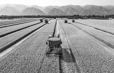 端午时节,山西省小麦喜迎丰收。5月28日,运城市盐湖区解州镇曲村的麦田里,联合收割机正在抓紧农时,抢收小麦。新华社发
