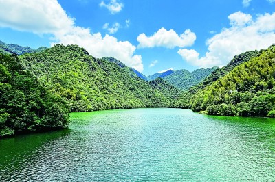 近日,位于江西省资溪县的大觉山景区,蓝天白云下,山间碧水如镜。本报记者 王旭东摄/光明图片
