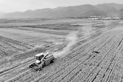 眼下,位于秦岭北麓的陕西省西安市长安区王曲街道神禾塬万亩优质粮食生产基地迎来大规模机收作业。当地种粮大户开始尝试引入无人收割设备,提高农业生产效率。图为6月6日,收割机在神禾塬万亩优质粮食生产基地作业。新华社记者 邵瑞摄