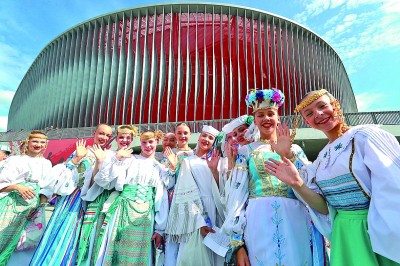 6月7日,中国援白俄罗斯国家足球体育场正式启用,中国和白俄罗斯国家青年足球队友谊赛当天在这里举行。该体育场是共建“一带一路”重点工程,坐落于白俄罗斯首都明斯克市工厂区。图为身着传统服装的女孩们在体育场前合影。新华社发