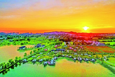 记者眼前,一派美景——夕阳把大大小小的湖面染成橘色,沿岸树林密密匝匝,草坪上三三两两散落着帐篷,有人索性直接一躺,享受悠闲。